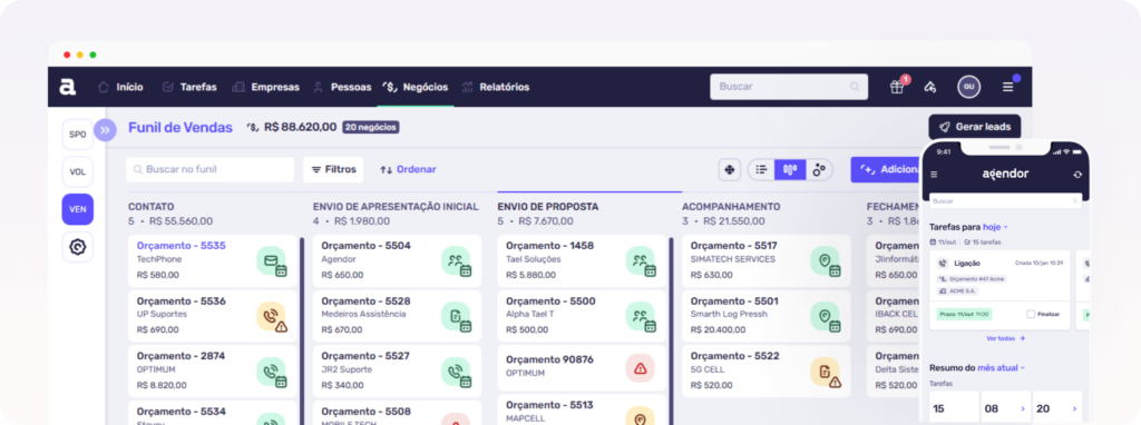 Além disso, o Agendor possui funcionalidades como automação de tarefas, gestão de contatos e empresas, histórico completo de interações e relatórios personalizados.